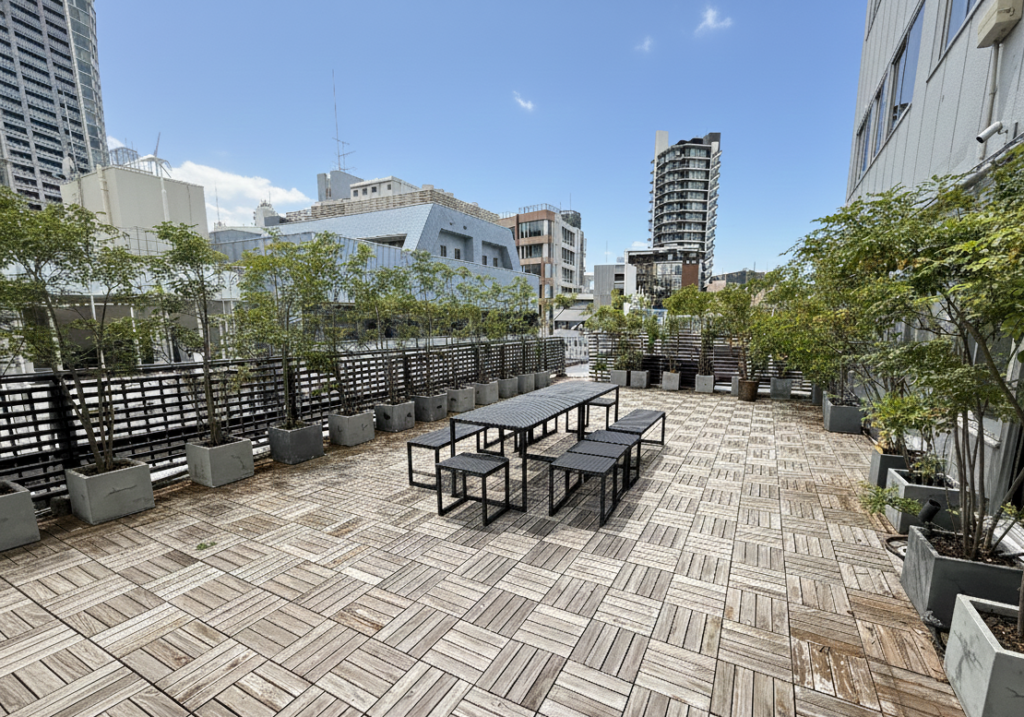 ランチタイムやワークショップの合間には、テラスへ出て深呼吸。渋谷の空を眺めながらの雑談は、会議室の椅子の上では出ないカジュアルなアイディアを引き出します。パッケージには机、椅子、音響設備がすべて含まれているため、当日のレイアウト変更もスムーズです。用途に合わせて、島型やシアター型など自由自在に構成いただけます。